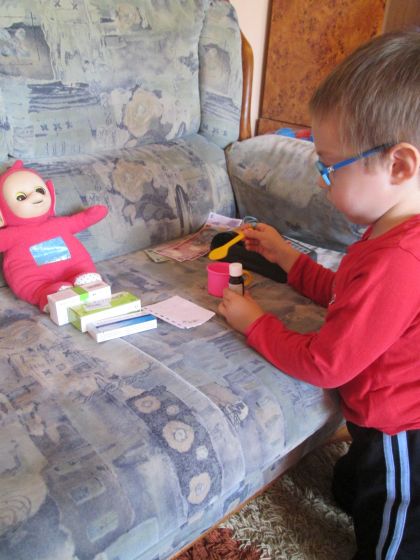 Apoi, ca un adevarat doctor, s-a apucat sa isi trateze pacientii. Avea pacienti care sufereau de diferite boli si el le asculta inima, le lua temperatura, le dadea injectii si medicamente, ii pansa. Eu veneam cu fiecare pacient la el si ii explicam ce problema are. Avea grija sa isi puna masca sa nu ajunga microbi la pacienti.