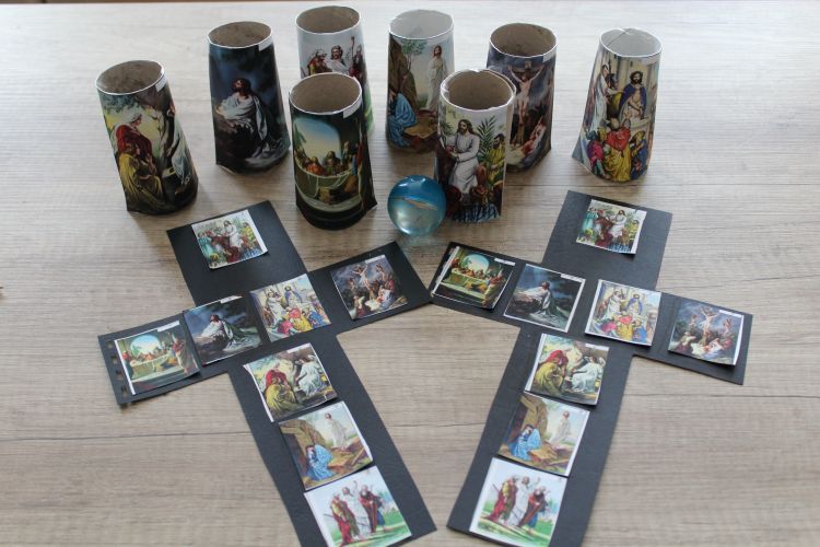 Rolele cu imagini le-am insirat pe jos, iar copiii aruncau pe rand cu o mingiuta, incercand sa nimereasca rolele. Cand reuseau sa nimereasca o imagine, aveau dreptul sa lipeasca pe crucea lor acea imagine. Copilul care reusea primul sa isi lipeasca toate imaginile, era castigator.